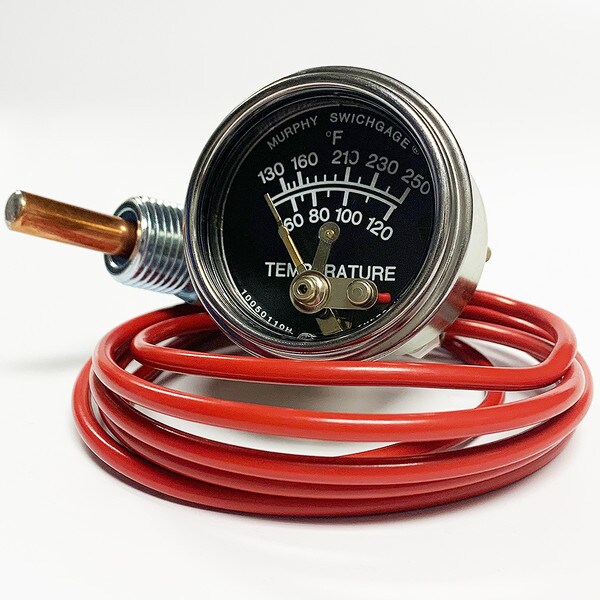 The 20T-F-250-6-1/2 is a 2" Temperature Swichgage®. This very popular design features a diaphragm-actuated, temperature-indicating gage, with a built-in electrical switch for tripping alarms and/or shutdown devices. This model has a 6 foot capillary length with a standard 1/2-14 NPT threading, and a temperature range from 130-250°F (54-121°C).