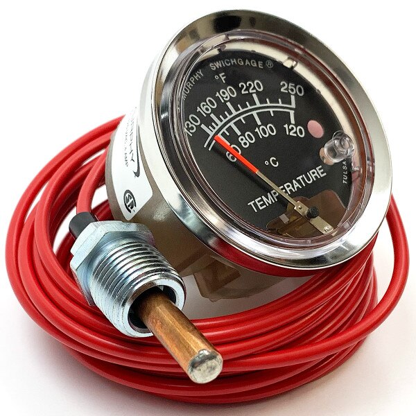 This vapor actuated gage features a sealed fourteen foot (14’) capillary tube, a sensing bulb, and a 130-250°F (54-121°C) temperature range.
