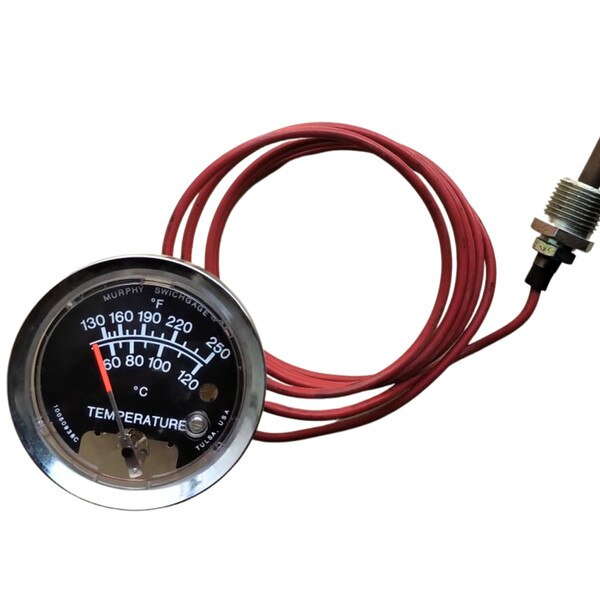 The Mechanical 130-250F Temperature Murphygage 2.5" with 6-1/2 Ft Capillary A25TG-250-6-1/2 by Murphy is diaphragm-actuated, temperature-indicating gage without contacts/switch. This rugged, built-to-last instrument is fully sealed from the environment by the unique combination of a polycarbonate case and lens, a polished stainless steel bezel and O-ring seals. This vapor actuated gauge features a sealed capillary tube and a sensing bulb. When subjected to heat, the liquid in the sensing bulb changes to vapor creating pressure against a diaphragm mechanism. The diaphragm translates this vapor pressure into a mechanical gage reading.