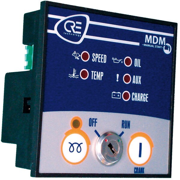 The MDM unit from CRE TECHNOLOGY is a basic, microprocessor-controlled unit designed to start and stop the genset manually using the key switch and pushbuttons on the front panel. It has high power relay outputs enabling it to interface directly with diesel gensets.