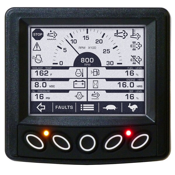Capable of handling sophisticated engine diagnostics as well as basic engine alarm/shutdown, the display provides values and control for your system.